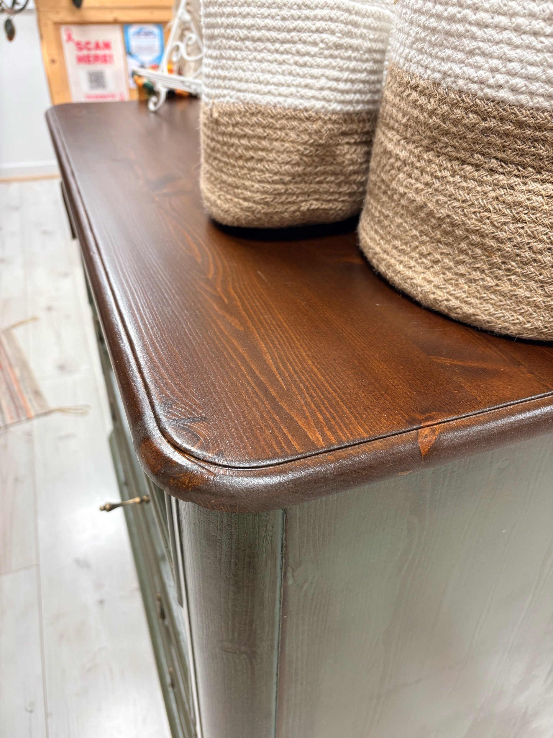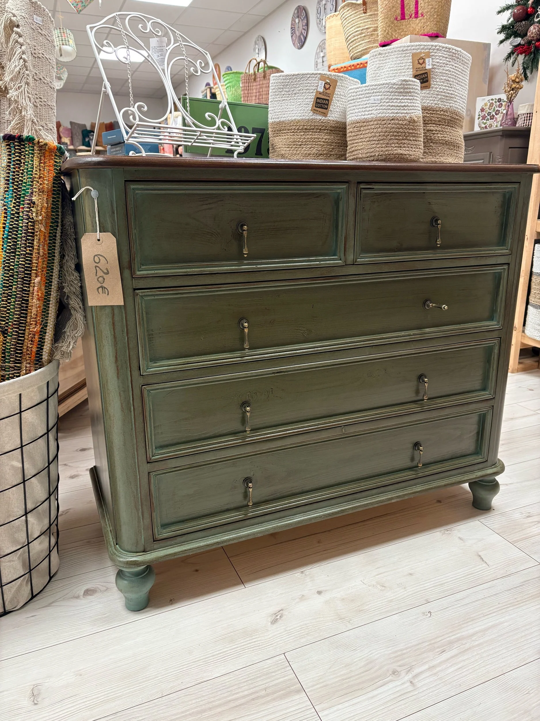This beautifully upcycled pine chest of drawers has been lovingly restored and hand-finished in a rich deep-green tone, giving it a timeless, character-filled look. Featuring five spacious drawers, elegant hardware, and a smooth, dark-stained top, it offers both charm and practicality for any room in your home.