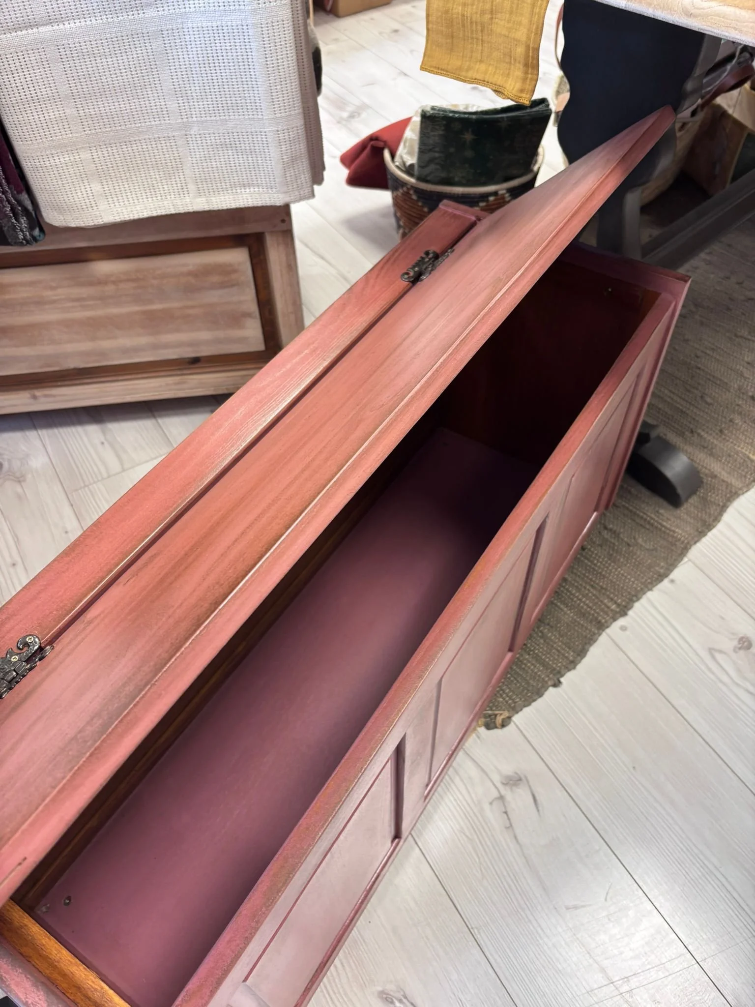 This one-of-a-kind toy box has been lovingly upcycled from solid pine, giving it a whole new lease of life while keeping all the charm of its original character. Finished in a rich, muted berry tone with soft, time-worn detailing, it’s designed to feel warm, lived-in and beautifully imperfect.